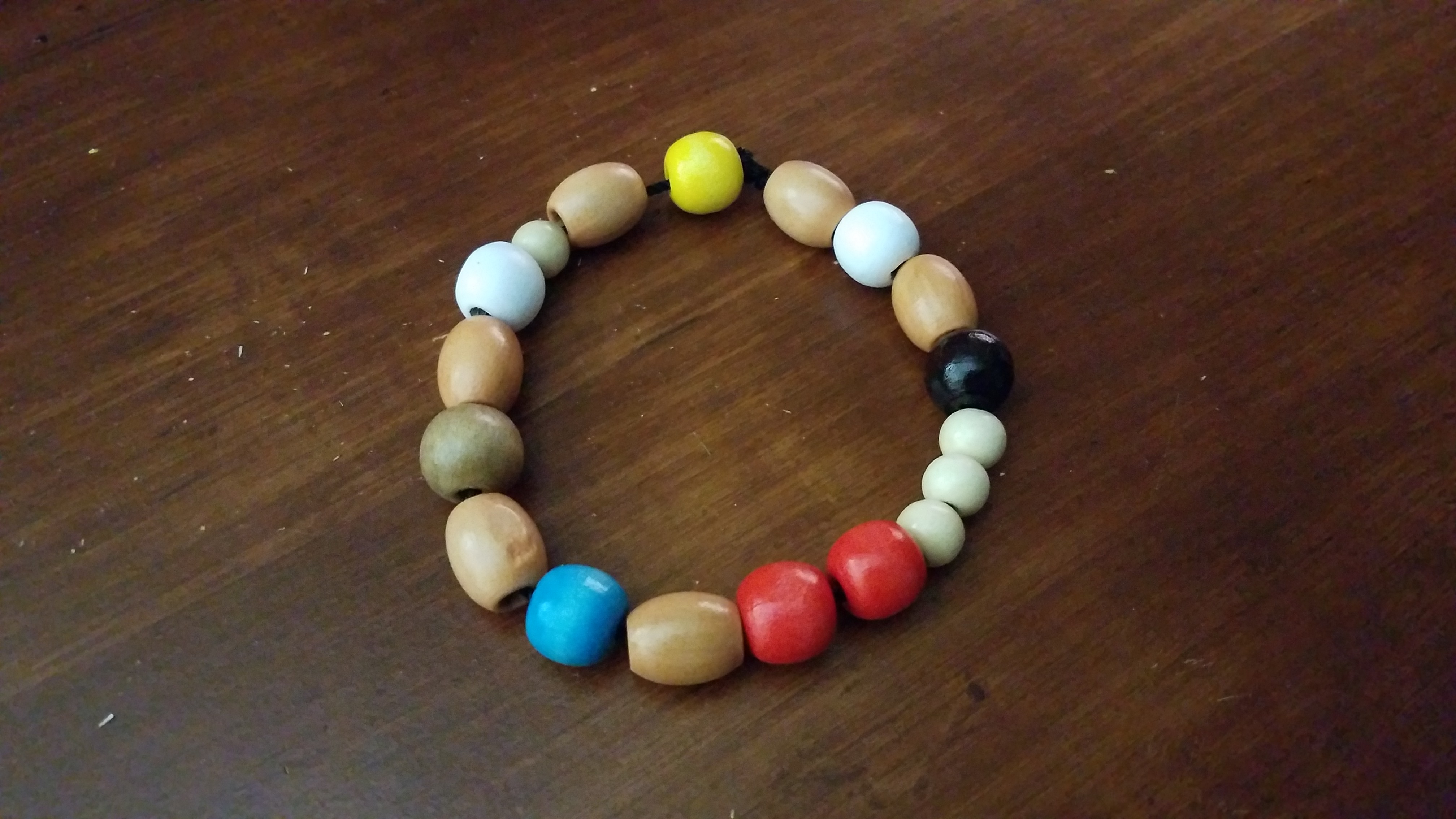 - Two red beads, three small pearl/white beads, and the black bead come next, with no oblong beads separating them.